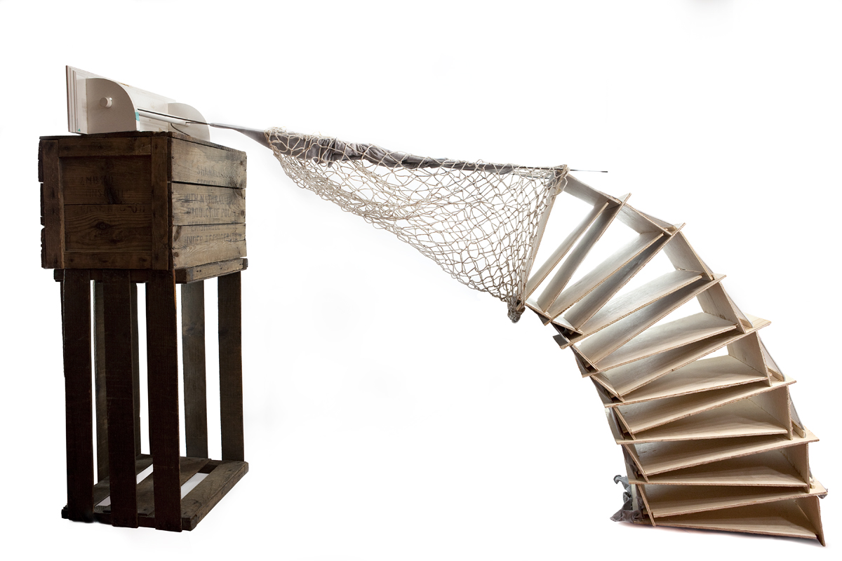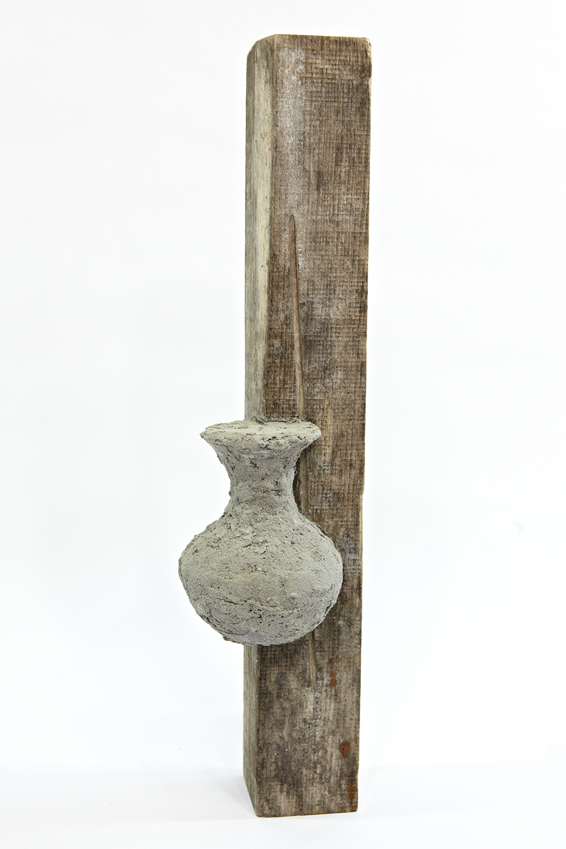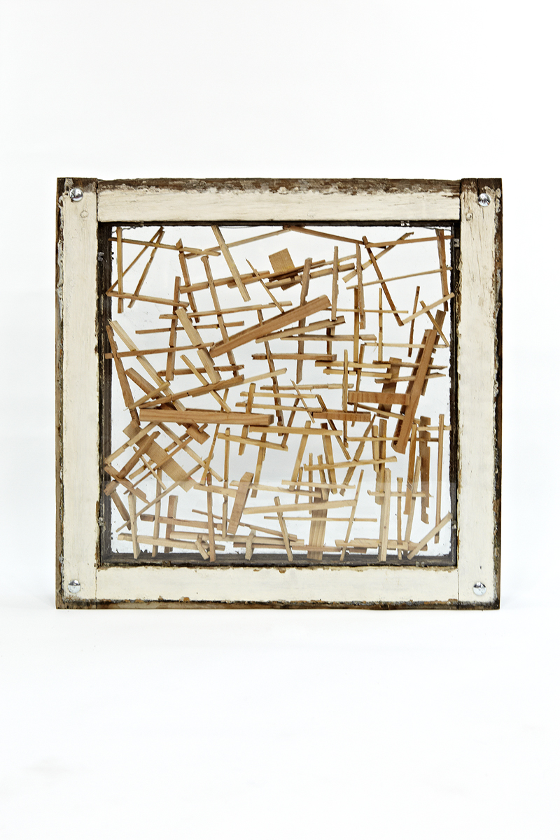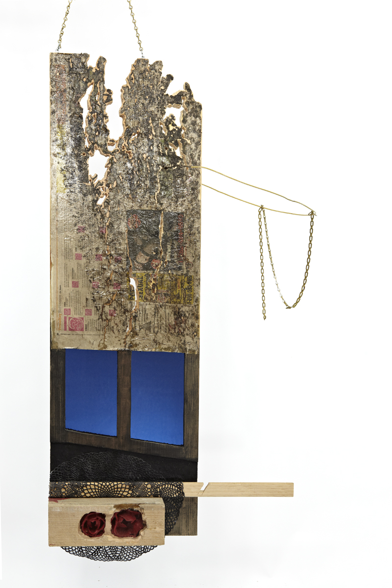 wood, plastic doily, plastic rose, wire, chain, newsprint, glass